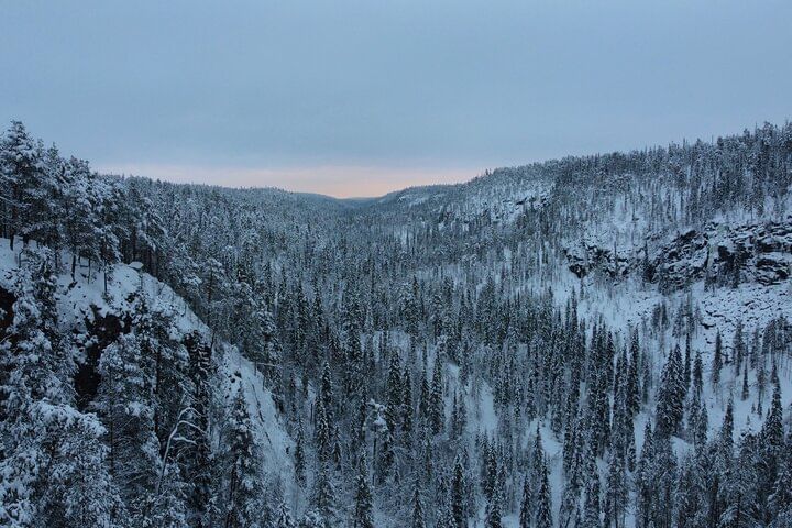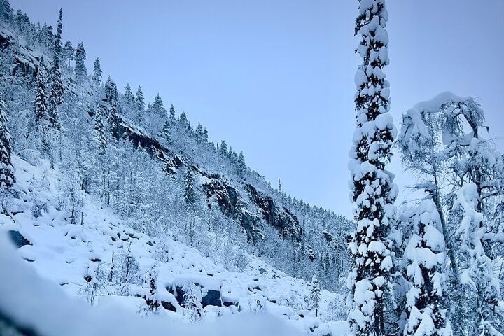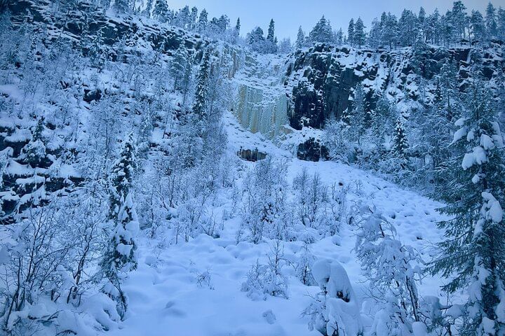Breathtaking hike to Frozen Waterfall Korouoma Nature Reserve. Be brave to come down up to 130 m (430 ft) deep canyon. On a valley, we will see three frozen waterfalls, a challenge of climbers, and do traditional Lappish BBQ.